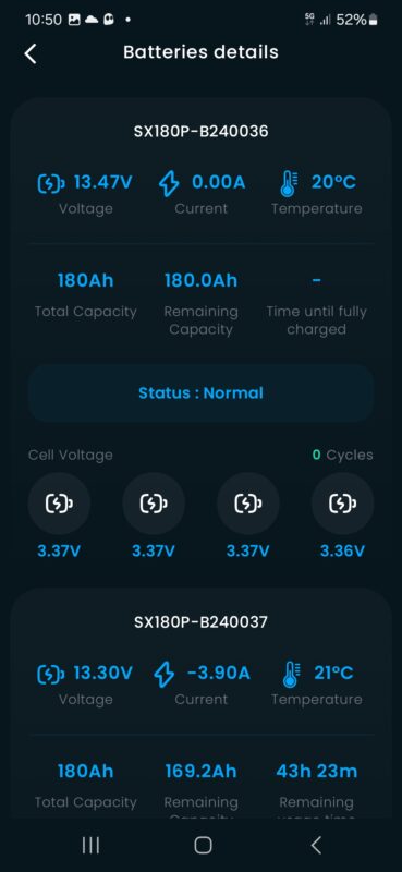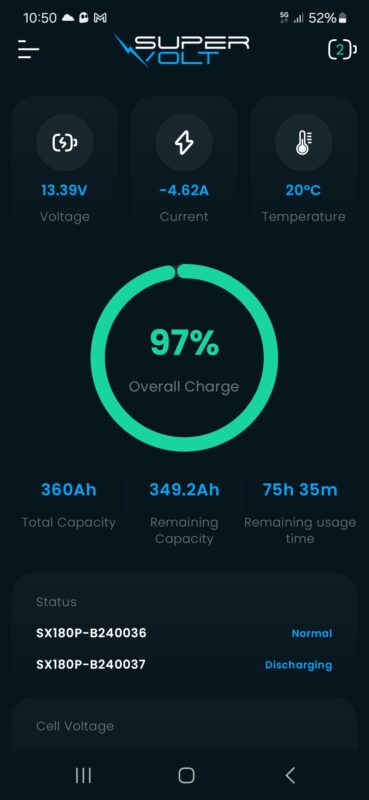 Erg handig! Nu kan ik in de app ook precies zien wat mijn bronnen leveren. Dat zijn het zonnenpaneel, de booster charger en de walstroom lader. Maar ik kan ook zien wat de verbruikers doen. De verlichting, TV, koelkast, kranen etc. Ik dacht dat het met LED verlichting het wel mee zou vallen maar dat blijkt tegen te vallen. Toch nog een dikke 5A als alles aanstaat. De app ziet ook dat er twee accu’s parallel staan. In de app zie je 1 grote accu met de mogelijkheid om ook per losse accu informatie op te vragen. Dat geeft inzicht waar je wat mee kan!